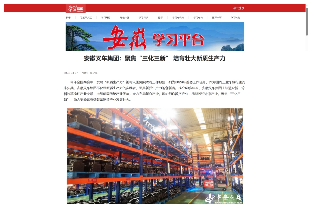 【学习强国、中安在线】安徽叉车集团聚焦“三化三新” 培育壮大新质生产力